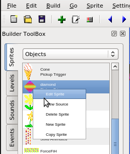 You can edit a sprite through the toolbox as illustrated above. Simply right click on the sprite and select Edit in popup menu.