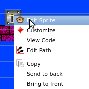 You can bring the level view back into focus by clicking any empty area on screen. Right-clicking a sprite on the canvas displays the pop-up menu as shown above. The options in that menu are explained below.
