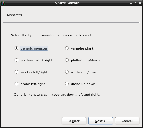 If you have picked the monster role, you will get presented with more choices to narrow down what you want this sprite to do in the game.